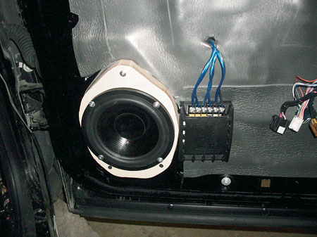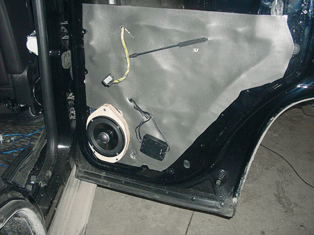 Тыловая и фронтальная автоакустика вмонтированы по обычной схеме: на дверном металле зафиксированы высокие кольца проставки, на которые устанавливаются головки. Фронтальные пищалки спрятали за нетронутые сеточки от стандартных Bose. А саундбар нуждался в использовании текстильной техники: на каркас и опорных колечек и стоек была натянута эластичная ткань, а затем – как полагается, ручная работа, стекло и смола. Модуль с 4-мя динамика был выполнен, учитывая возможности в последующем разворачивать его в направлении багажного отдела, когда до этого будет доходить дело, а пока он включен (через специальный выключатель) к фронтальным каналам, при этом создаются достаточно своеобразные эффекты в процессе просмотра видеопрограмм. Т.е. теперь дорога из дома будет не скучноватой…