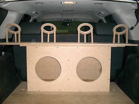 Таким образом, в систему добавился еще 1 усилитель и 4 коаксиальных динамика по 5 дюймов. Их подключение выполнялось с учетом последующих перспектив: каждый на собственный усилительный канал, с тем, чтобы затем играть фазами и уровнять для попытки (никто не дает гарантии, что выйдет, однако с гарантией не выйдет если не пробовать) воспроизведения 3-мерного звука «на поляне» при помощи линейного массива излучателей. С учетом перспективы саб ориентировались в сторону дверей сзади, в процессе работы в салоне это не помеха, а в будущем они будут стрелять куда нужно. Каждую из 12-дюймовых головок разместили в 36-литровый закрытый ящик на динамик. Усилители были разделены по бортам, их вмонтировали в подиумах, на взгляд очень больших для своего назначения, однако здесь имеется маленькая хитрость: за усилителями место намеренно выполнили достаточно просторным, это изолируемые отделы для небольших мелочей, которым не нужно болтаться по багажному полу. Шторки, которые открывают доступ к бар дачкам, изготавливаются по фирменной технике FoxStyle: в верхних деревянных стенах фрезеровали щели, в которых заправили края шторок – встык на полоски из алькантары наклеили алюминиевые полоски.
